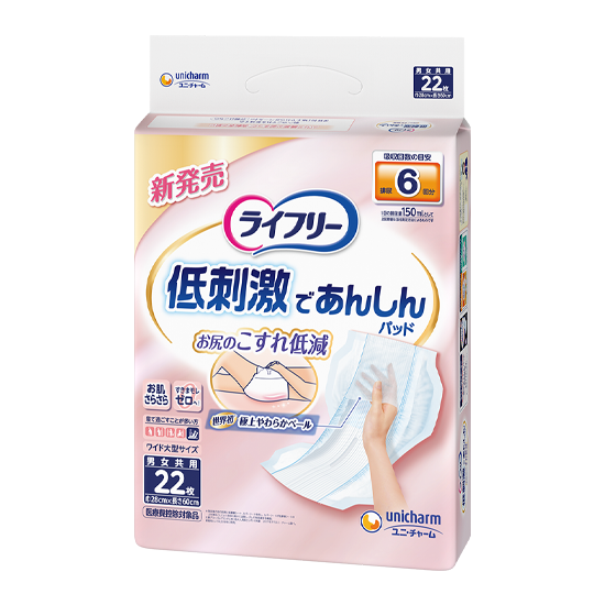 *1 A design featuring a low-friction sheet and cover sheet on the rear inner side of the product. The cover sheet slides over the low-friction layer to move with the body and reduce skin irritation caused by shifting. Based on Unicharm research (July 2017) targeting adult urine absorption pads among major global brands. Launched for professional use in 2018.