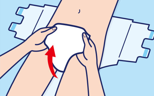 Adjust the position of the body so that the body is in the center of the diaper, and pull up the diaper so that there are no gaps between the legs and the leg openings.