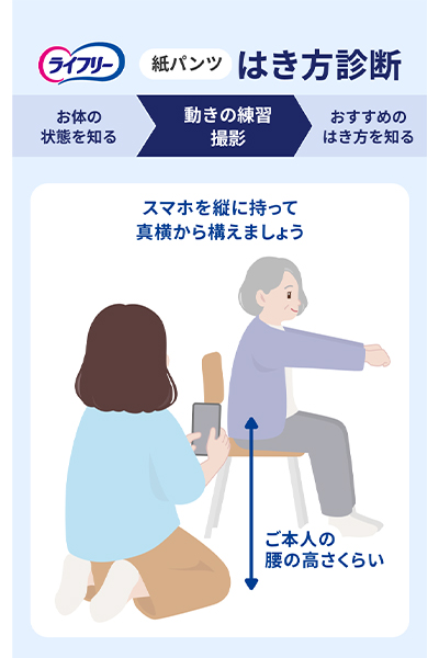 紙パンツをはく動作には、柔軟性やバランス能力など多くの機能が関わっています。従来は専門家が目視で判断していたこれらの要素を、動画解析技術によって客観的に評価します。データに基づいた「最適なはき方」を知り、ひきつづき安心してトイレで排泄ができるように、本システムは開発されました。