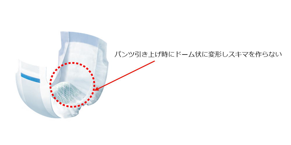 ※3:パンツ型おむつにパッドを装着した際に、変形したパッドの凸部に接触するように凸変形する一対の変形誘導部を備え、変形誘導部は外側から内側に向かって、長手方向外側に傾斜している構造